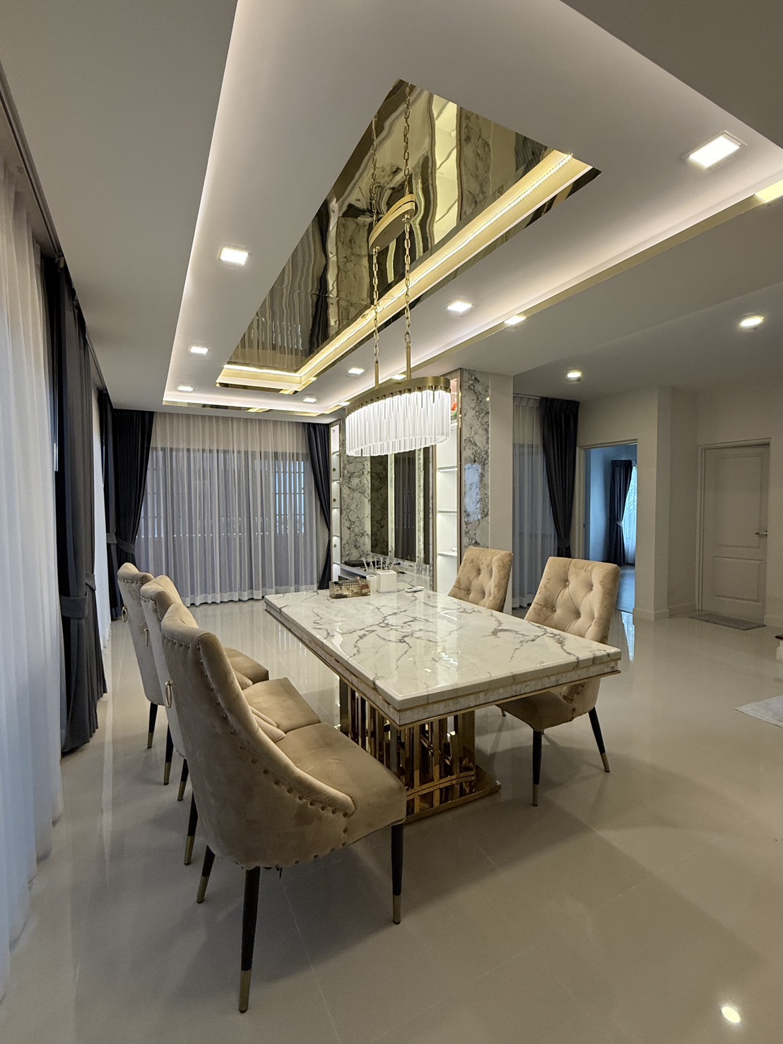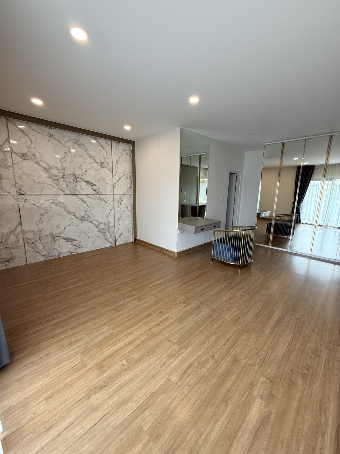 -ห้อง MasterBedroom บิ้วจัดเต็ม ทั้งหัวนอนซ่อนไฟ โทนการตกแต่ง Luxury Modern ตู้เสื้อผ้าใหญ่บานกระจก ชั้นเก็บของบานกระจก หน้าทีวีบิ้วให้ครบ